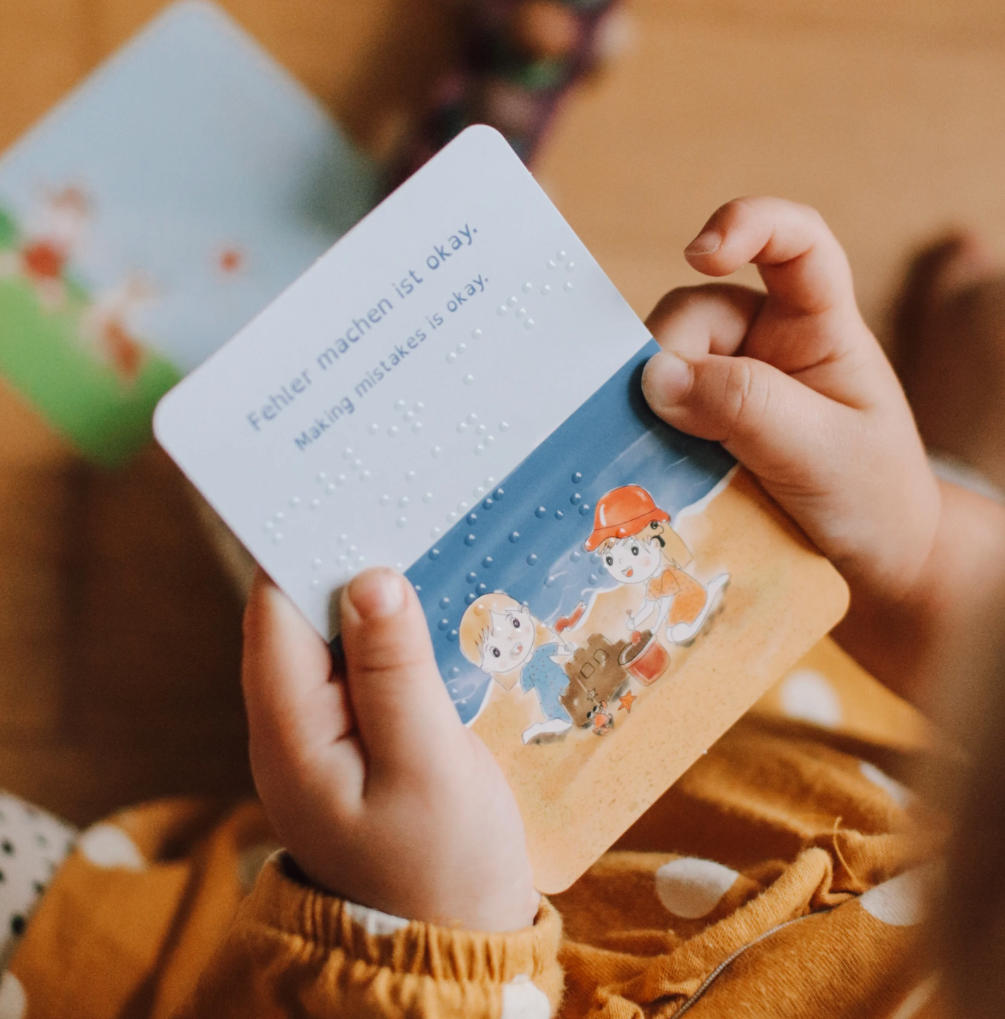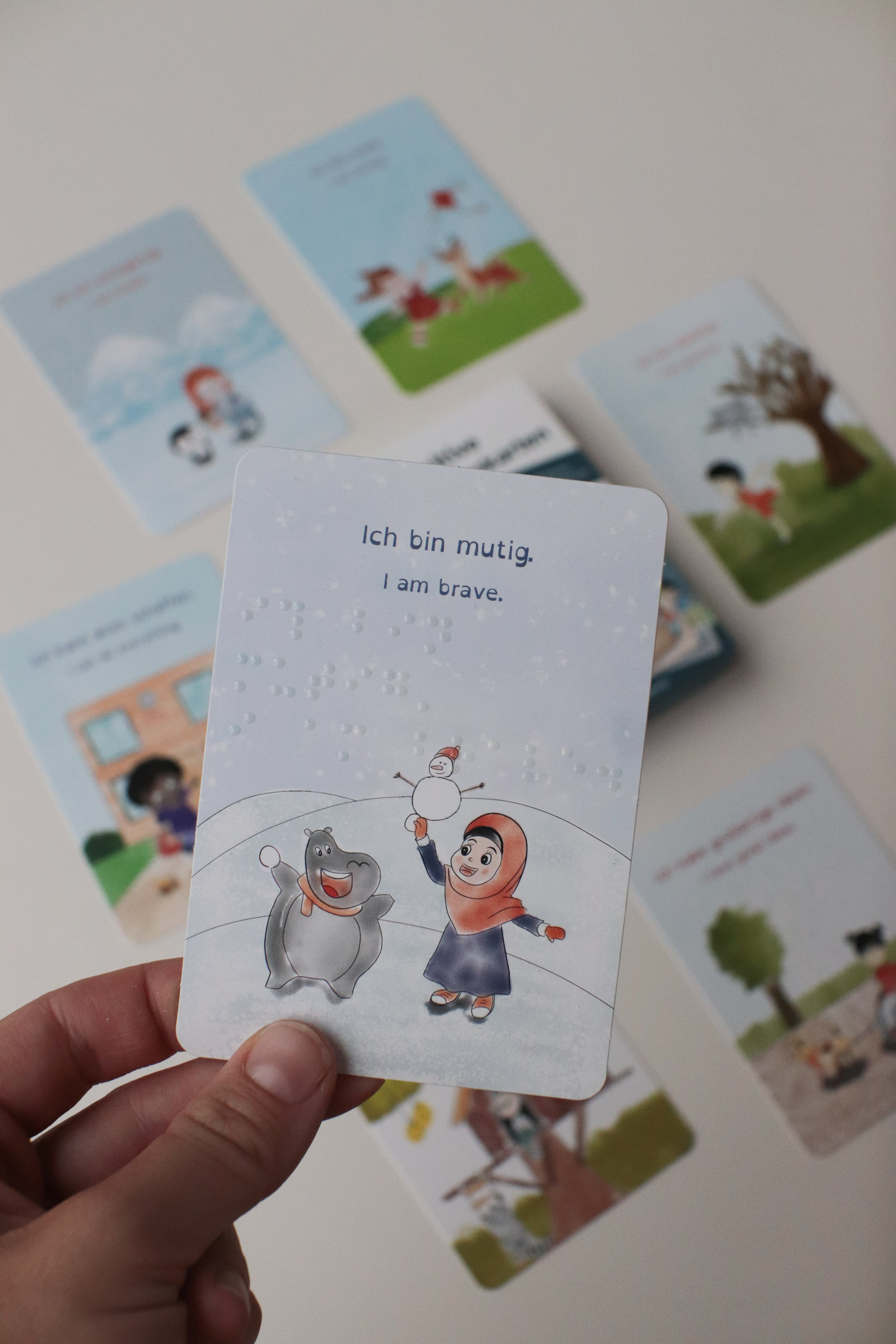 Jede Karte ist mit Braille-Schrift versehen. Damit möchten wir weitere Barrieren zwischen blinden und sehenden Kindern abbauen.